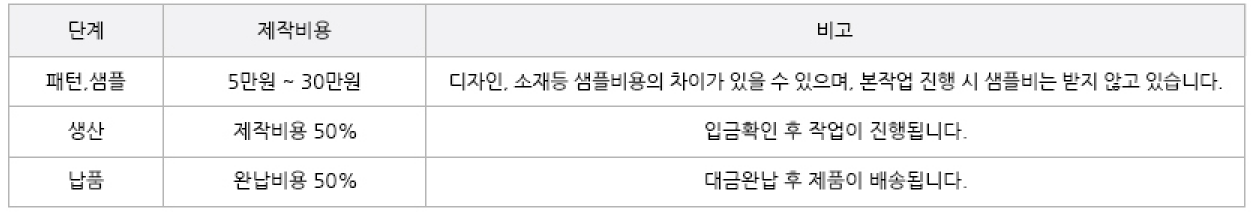 - 샘플의 수정사항을 반영하여 Q C샘플제작및 확인 후 생산을 진행합니다.